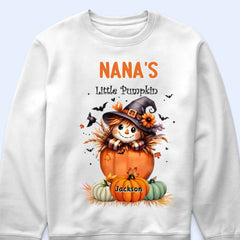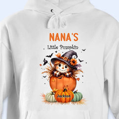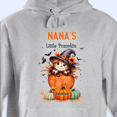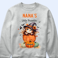 Grandma's Little Pumpkins - Fall Season Background - Scarecrow Grandma With Pumpkin Kid Names Personalized Sweatshirts